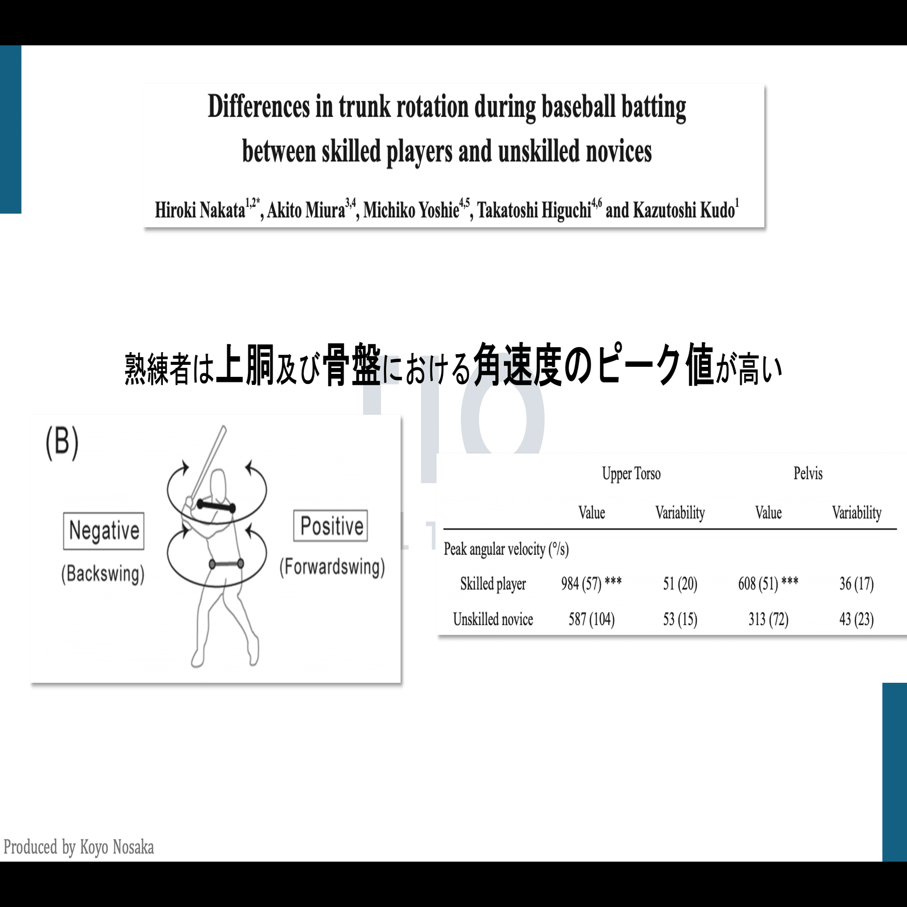 上半身や骨盤の角速度のピーク値が高いと報告されています。
